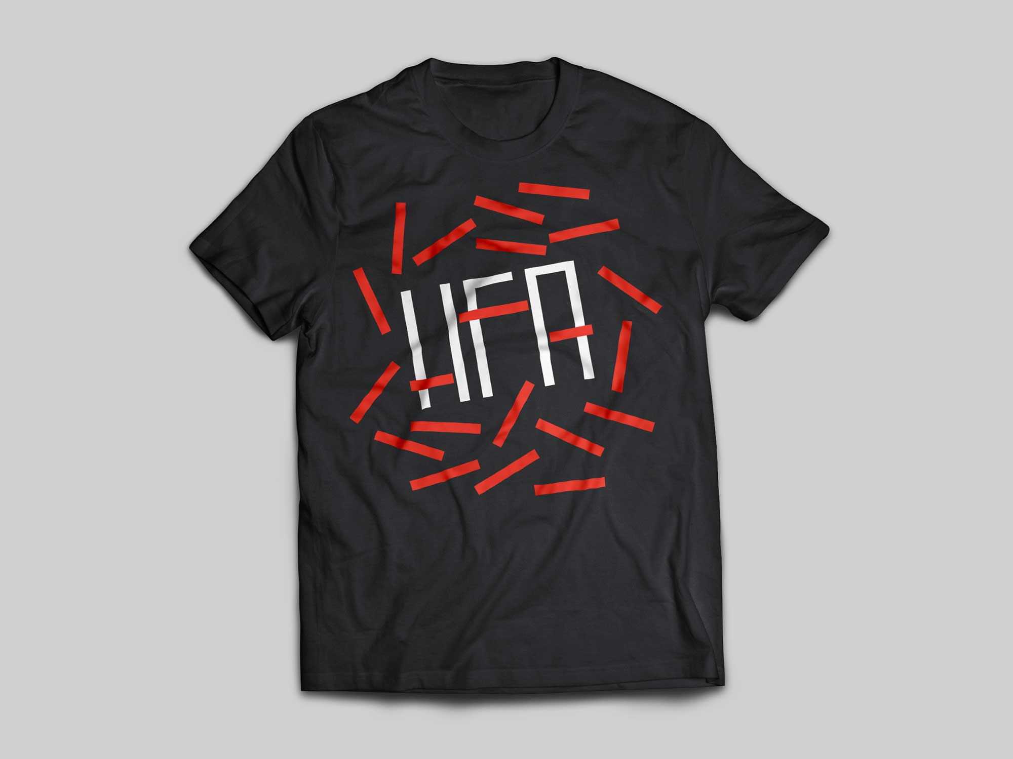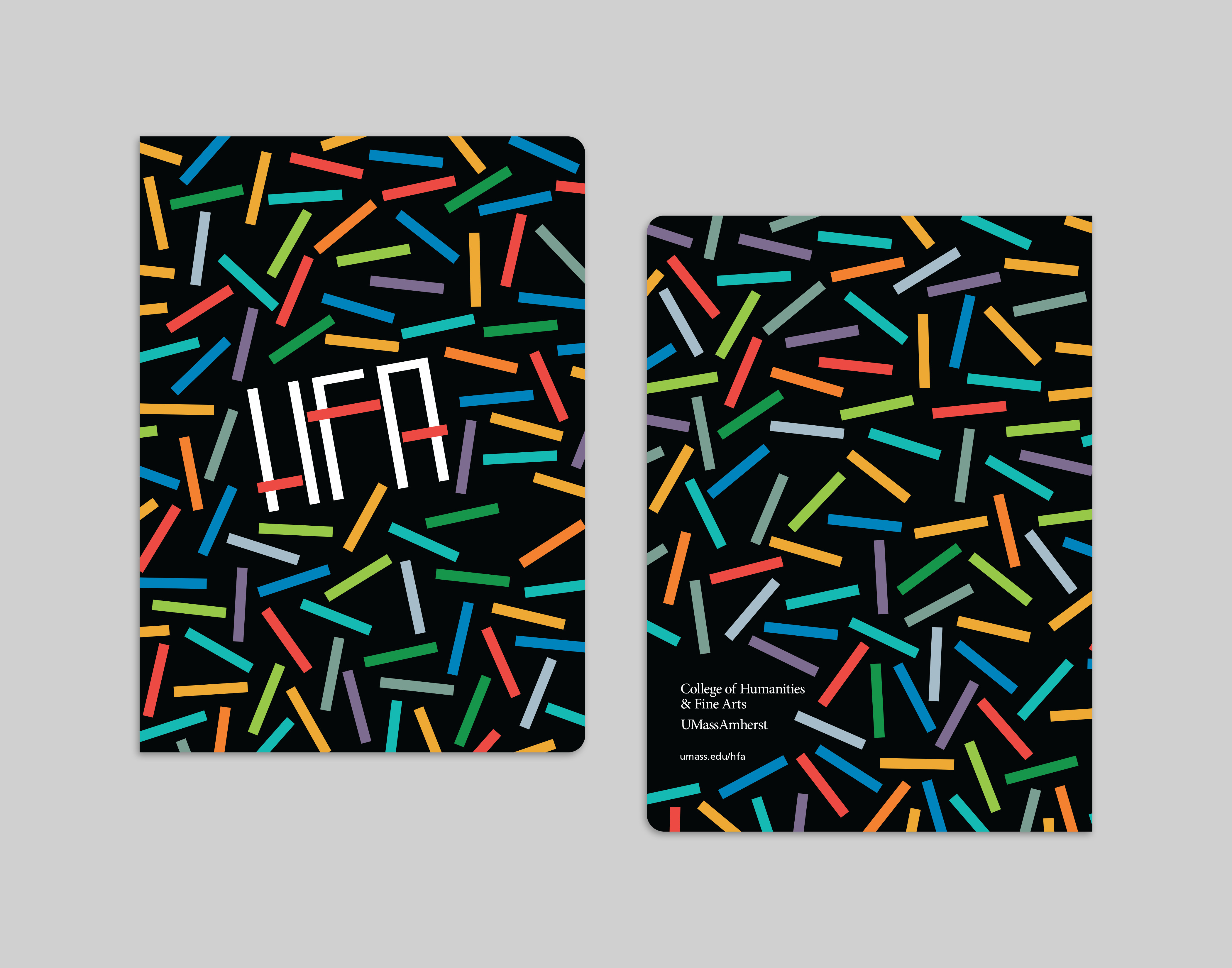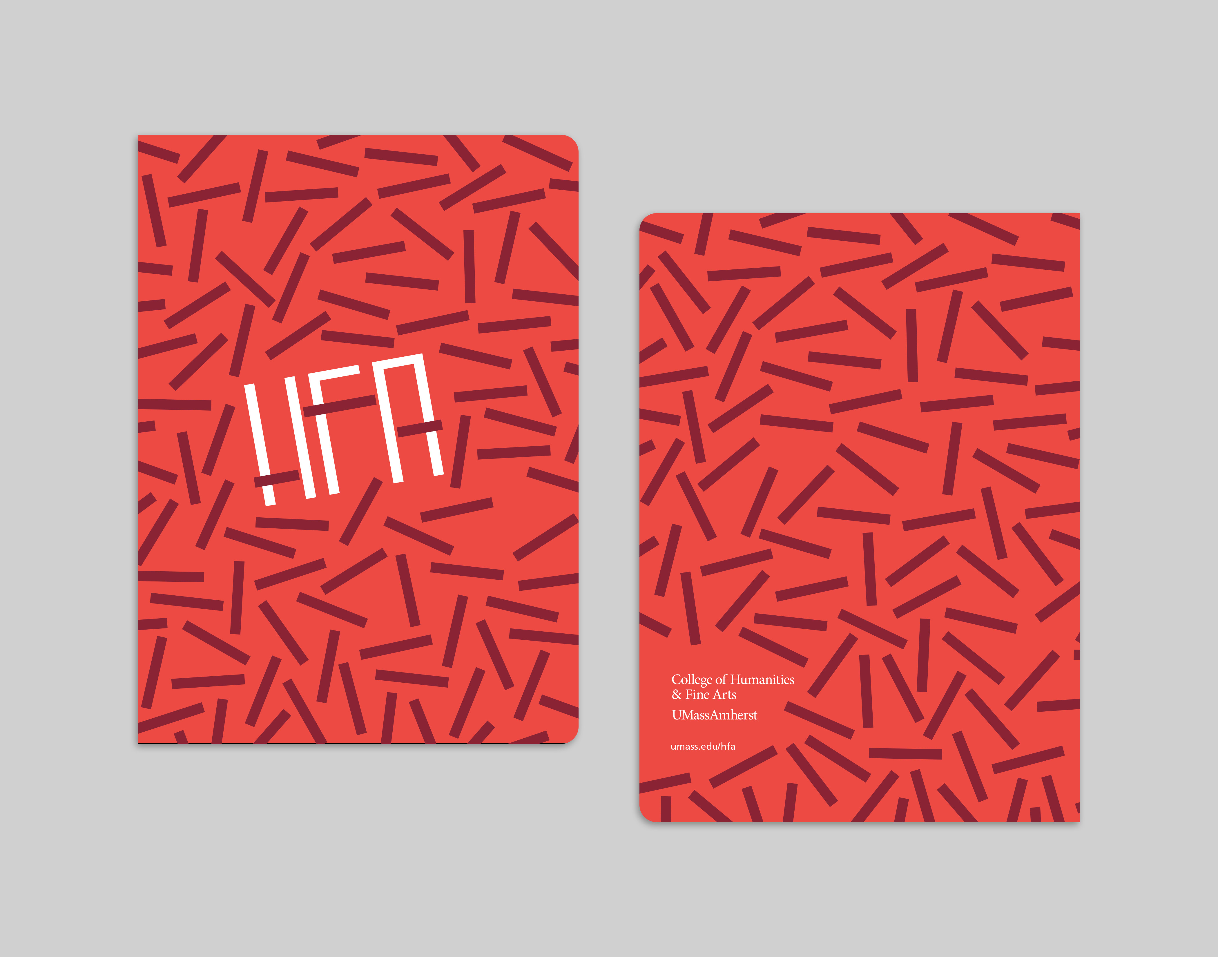 Notebooks and t-shirt designed as promotional items for the College of Humanities & Fine Arts at UMass Amherst.