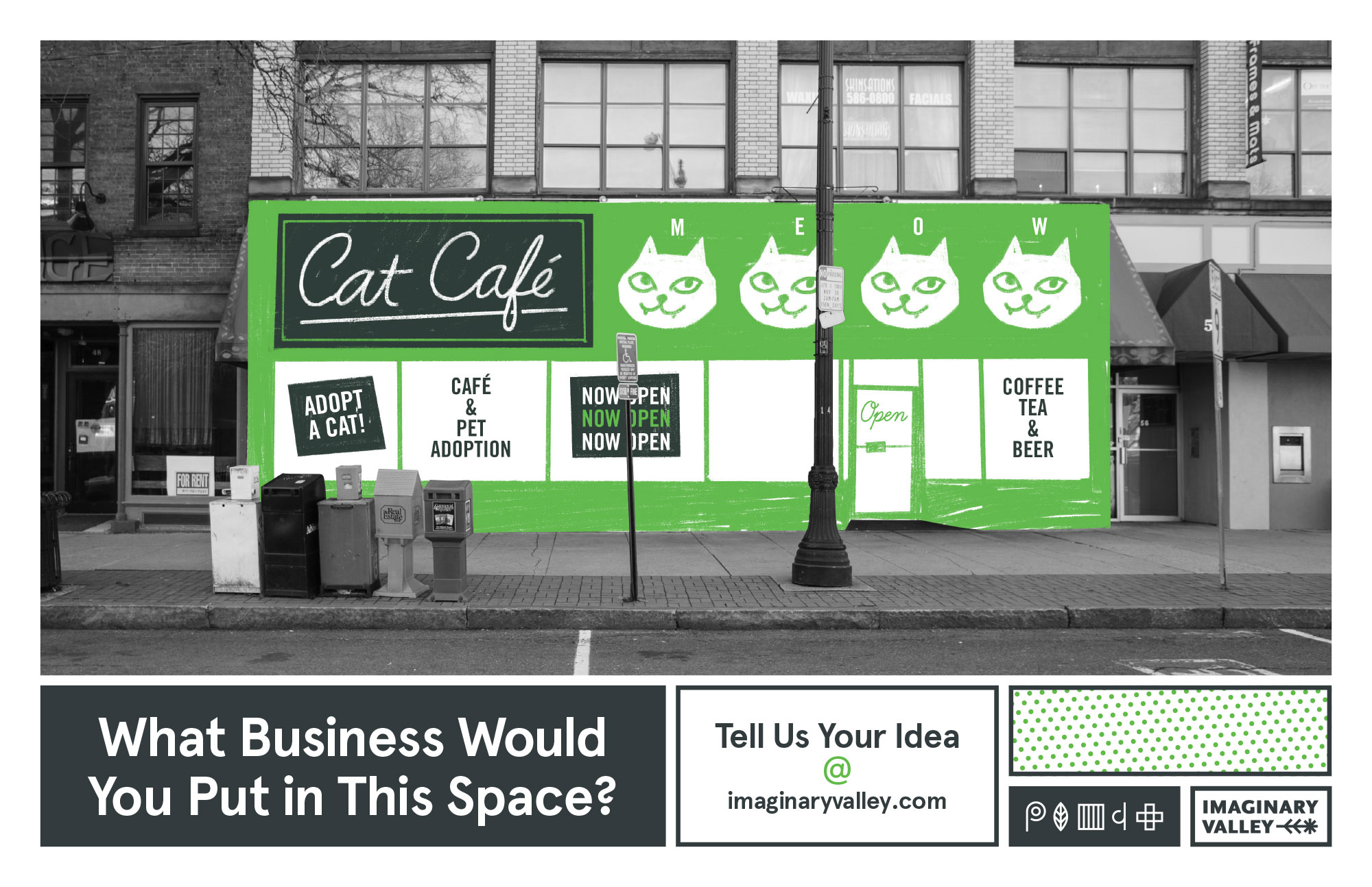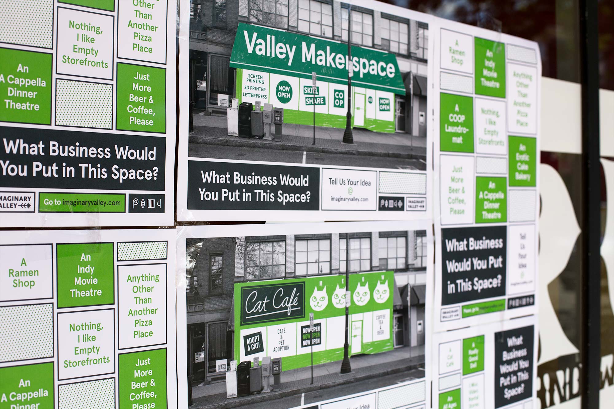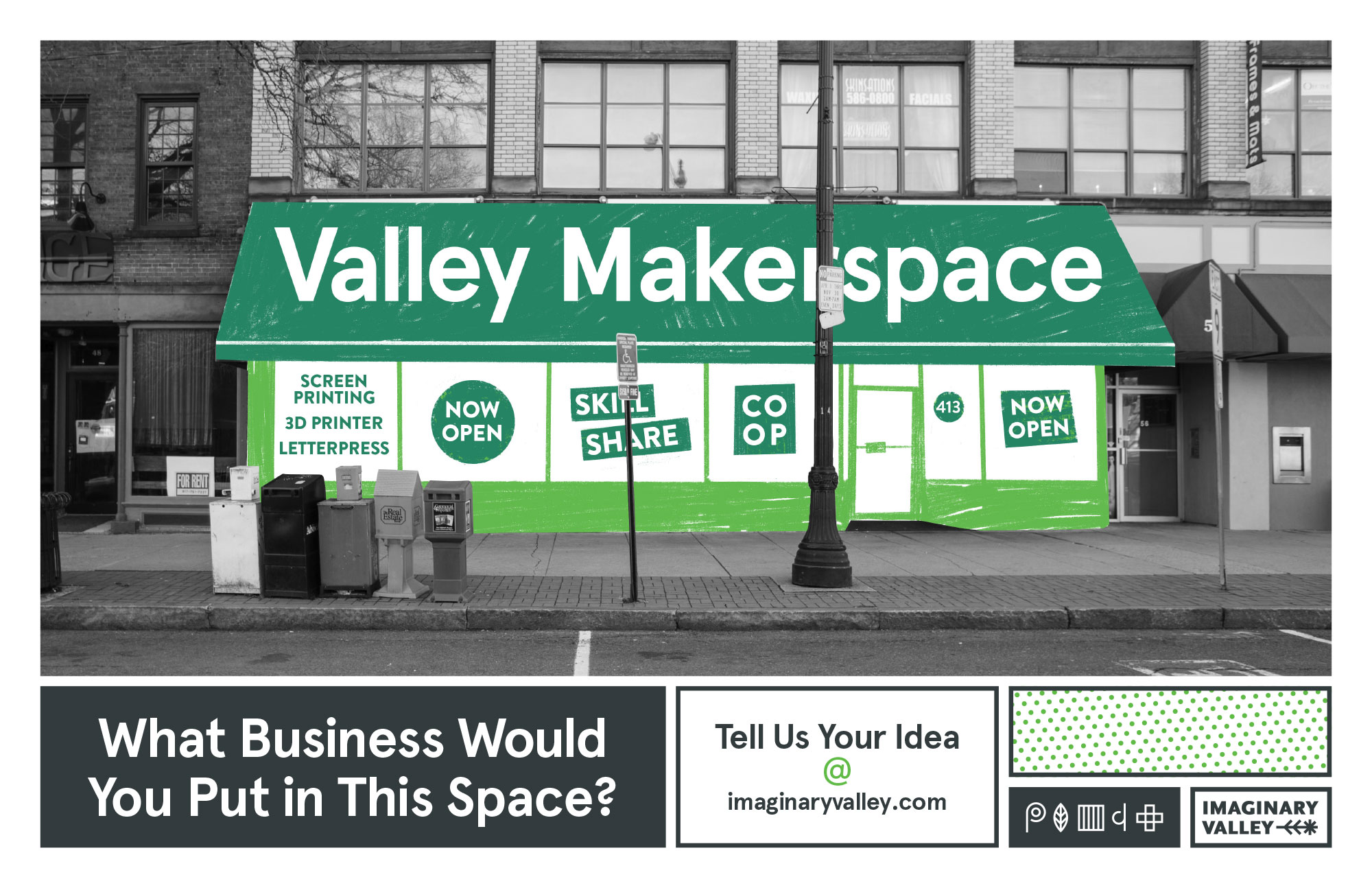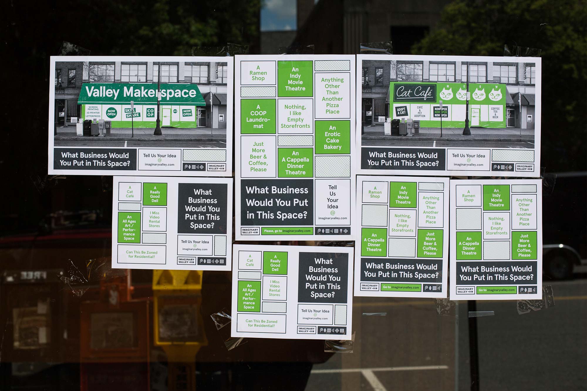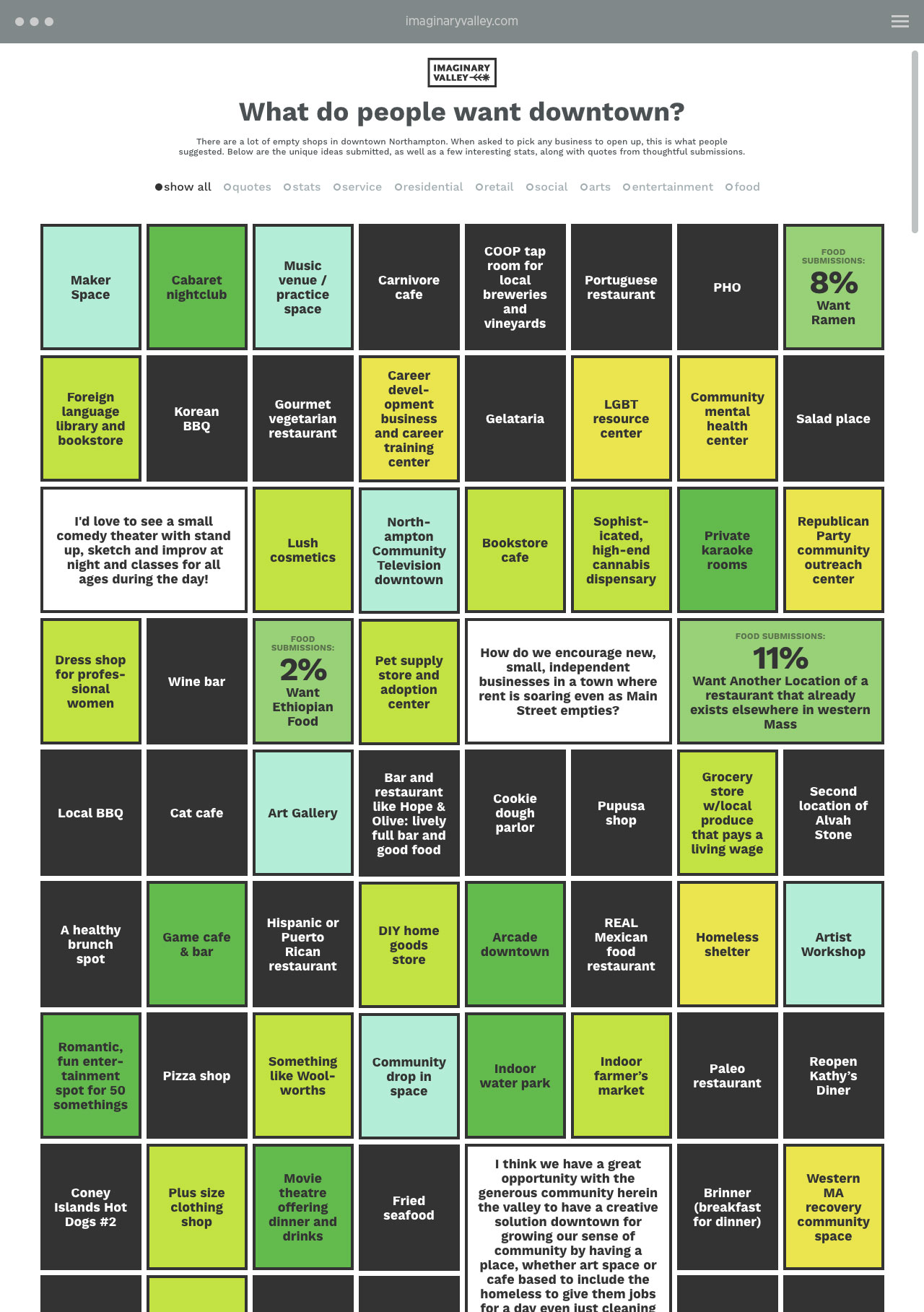 A collaborative art project created to generate positive conversation around the empty commercial spaces in downtown Northampton. We placed posters on empty storefronts and shared graphics online that asked people what business they thought should open in these vacant spaces. Once submissions were gathered, we designed and built an interactive filterable listing of the results.