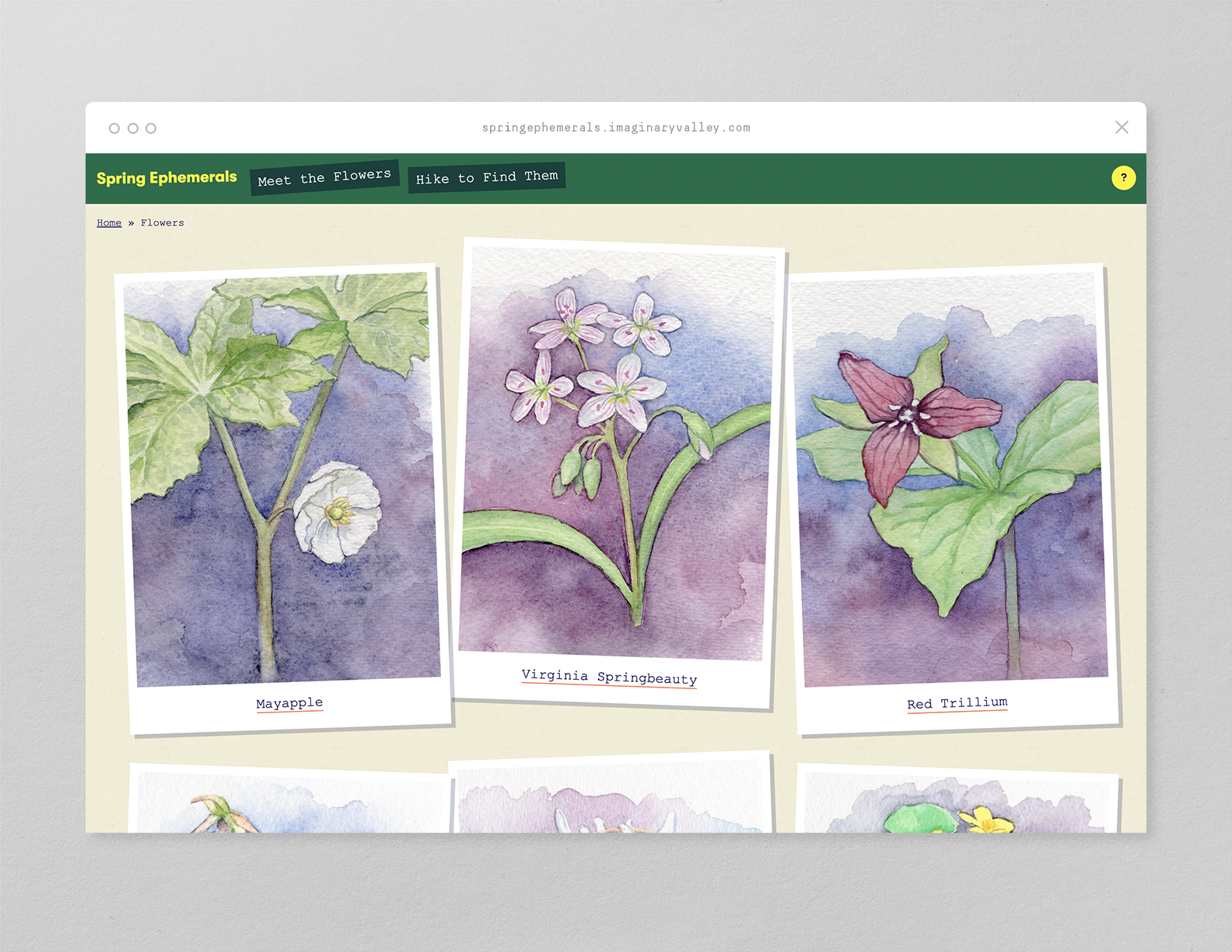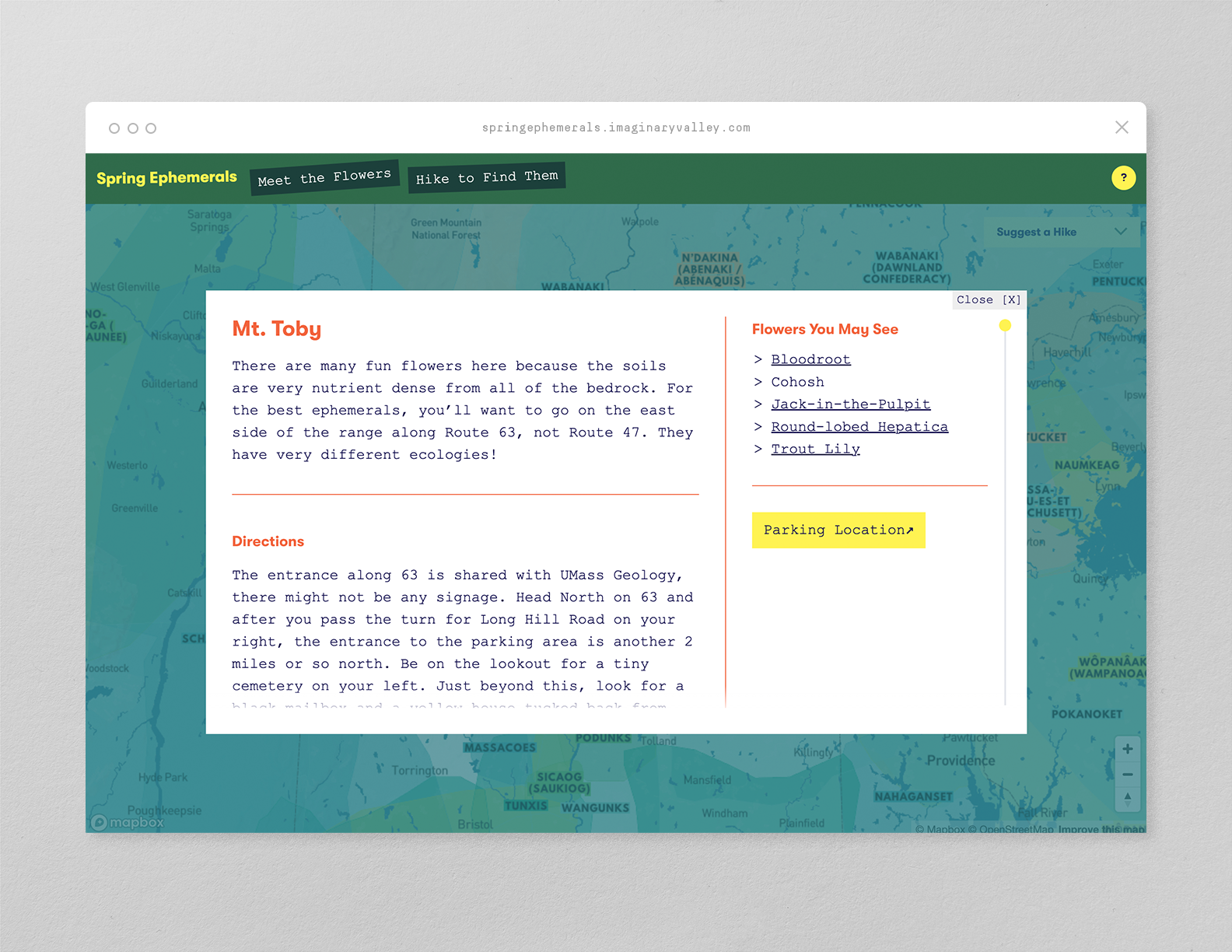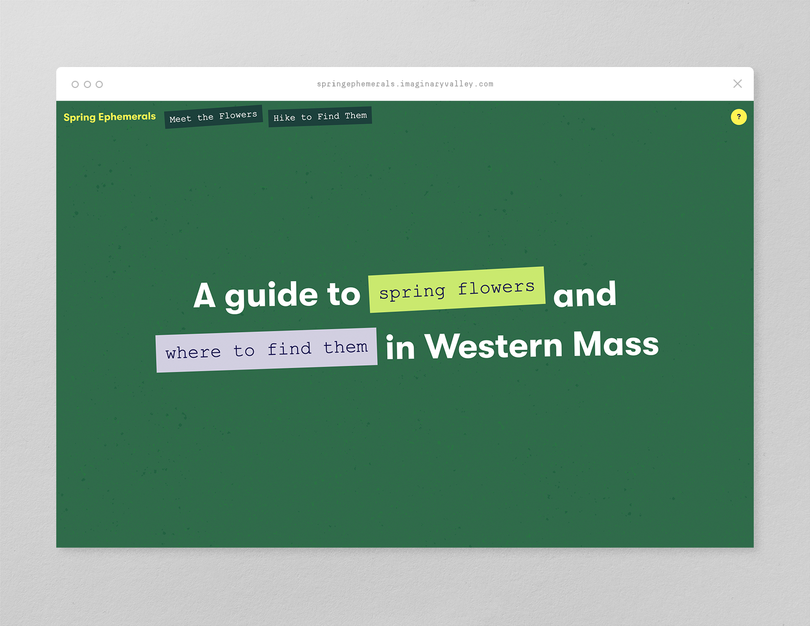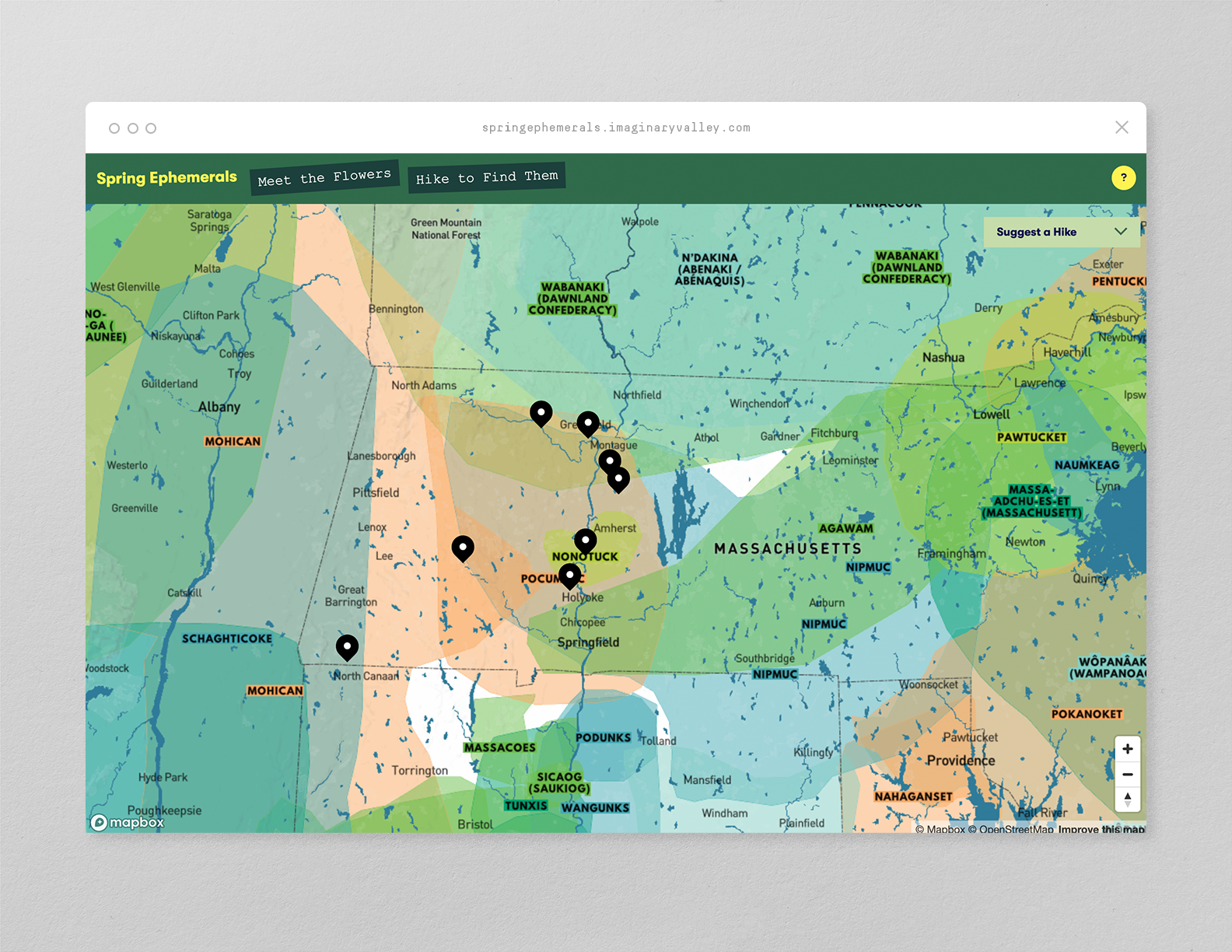 Web design and development for a community art project, cataloging spring flowers and where to find them in Western Mass. The site included integrating geographic data from native-land.ca to create an overlay of the boundaries of Indigenous nations.